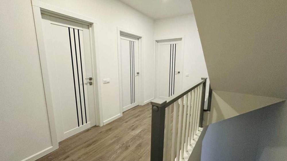 Другий поверх: коридор, санвузол, дві дитячі кімнати та основна спальня з виходом на балкон.