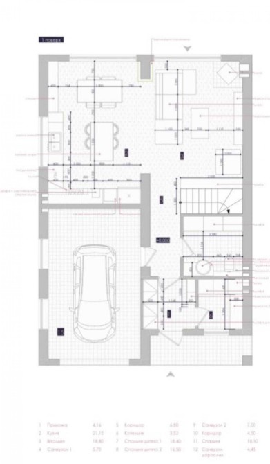 Перший поверх будинку включає: одна житлова кімната, санвузол, кухня, котельня, гараж, тераса