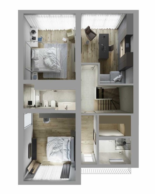 Другий поверх: три житлові кімнати, два санвузли, гардероб