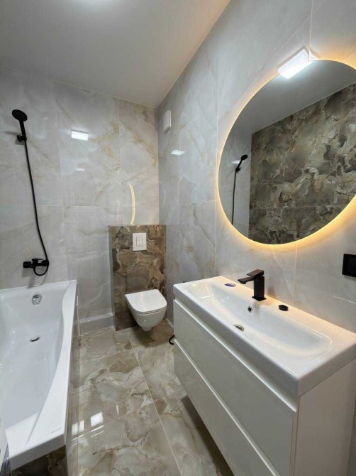 У ванній кімнаті встановлено ванну, санвузол, умивальник, пральну машину та дзеркало з підсвіткою.