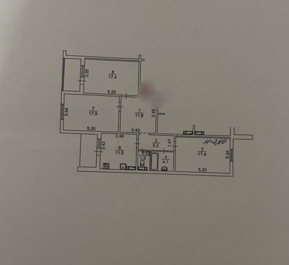Загальна площа 94.4 кв.м. Висота стель 2.6 м. Три просторі окремі кімнати: