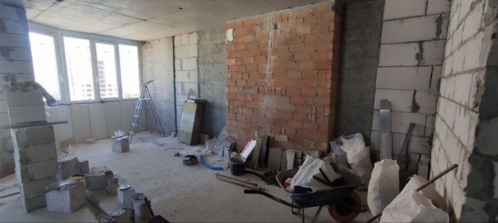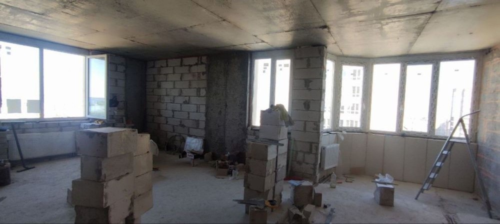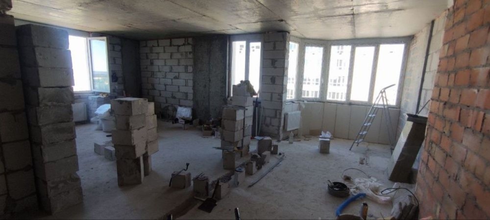 Пропонується простора видова квартира площею 77 м², яка знаходиться на етапі перепланування. Поточне планування передбачає дві окремі кімнати та велику кухню-студію. Завдяки вдало продуманому розміщенню приміщень, житлова площа є максимально ефективною відносно загальної площі.