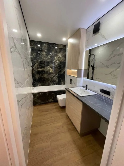 • Санвузол просторий, з ванною, інсталяцією, рукомийником, дзеркалом з підсвіткою, рушникосушкою