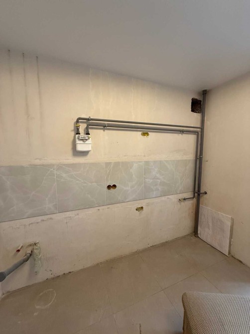 На кухні вже викладена плитка на робочій поверхні, що робить приміщення готовим до встановлення кухонного гарнітуру.