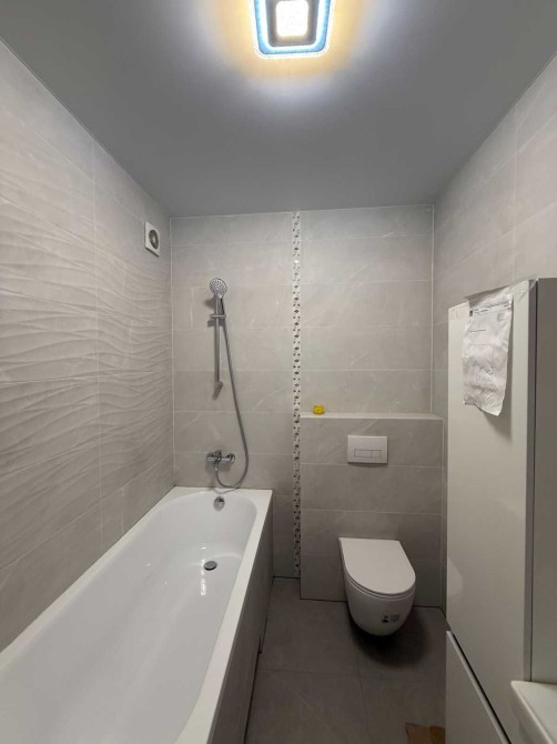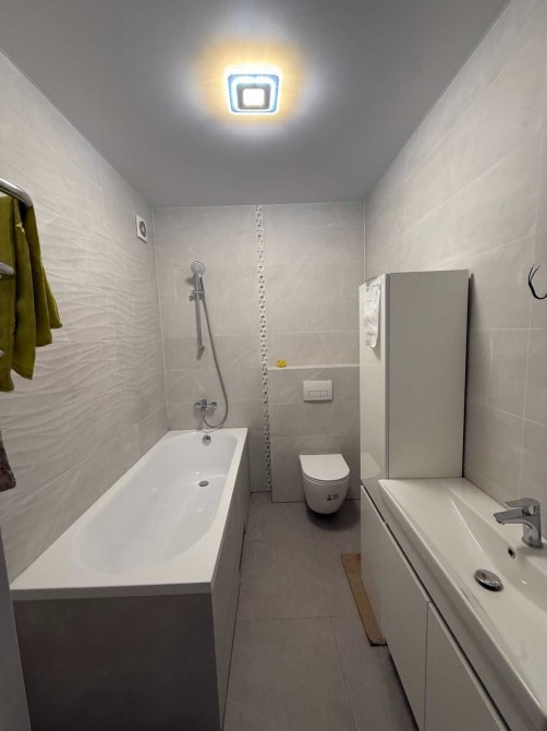Санвузол повністю облаштований сучасною сантехнікою, з оздобленням у спокійних, стильних тонах.
