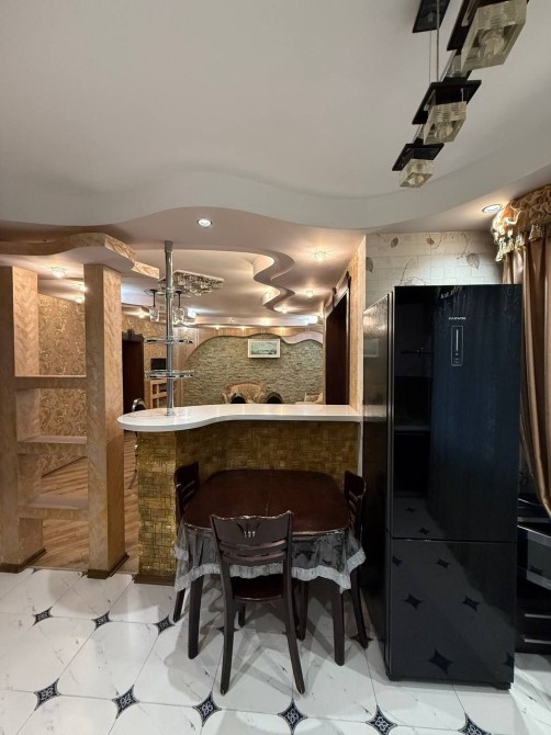 Величезна кухня студіо, яка розділена на дві зони барною стойкою. Зона гостьвої і зона кухні.