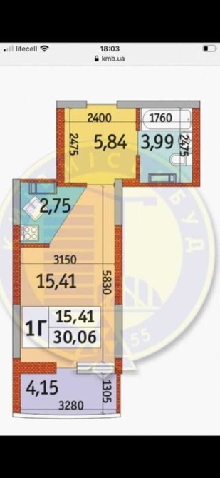 Загальна площа 31 кв.м., кухня 14,2 кв.м. 13/26 поверхового будинку.