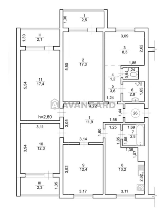Кімнати 17,4 м², 17,3 м², 12,4 м², 12,3 м² і 8,3 м².