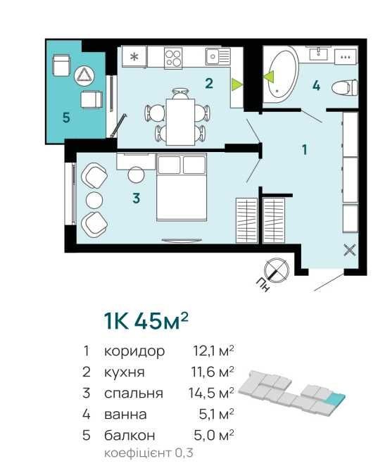 11 поверх із 16, площа — 45 м².