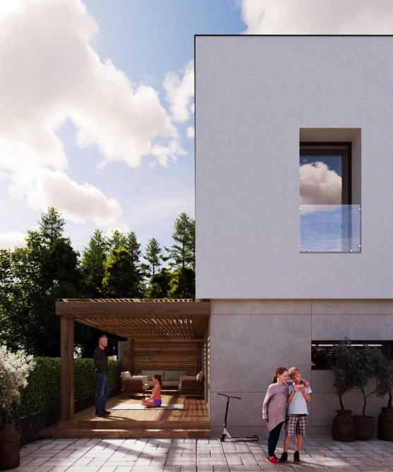 - Фасад: декоративна штукатурка + фасадна плитка