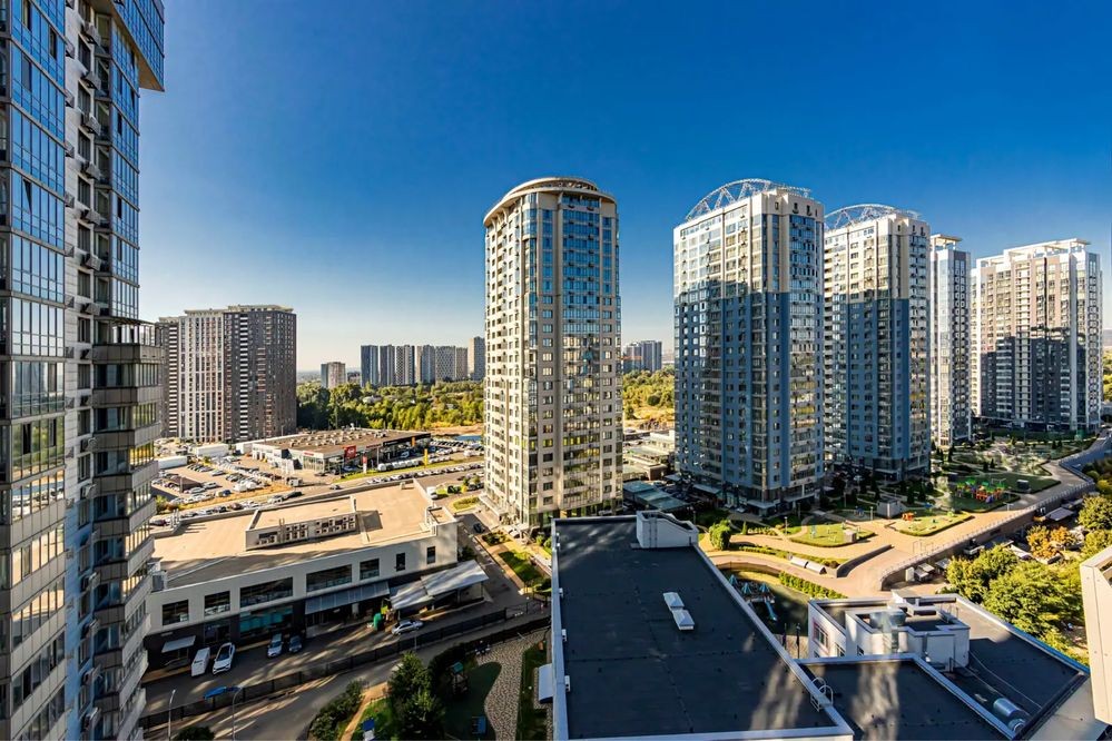 • простора кухня-вітальня з панорамними вікнами та зоною відпочинку з краєвидом на Осокорки;