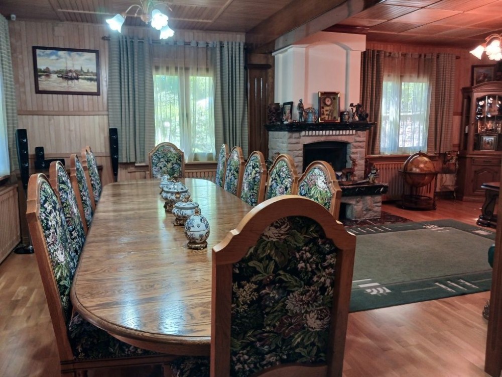Простора вітальня з великим столом, каміном та стильними меблями в класичному стилі — ідеальна зона для гостей та родинних вечорів.