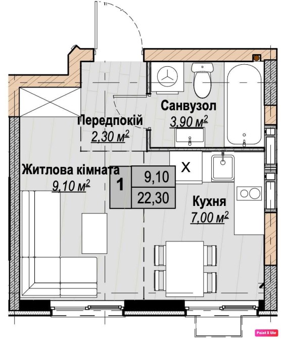 • Общая площадь 22.3 м2