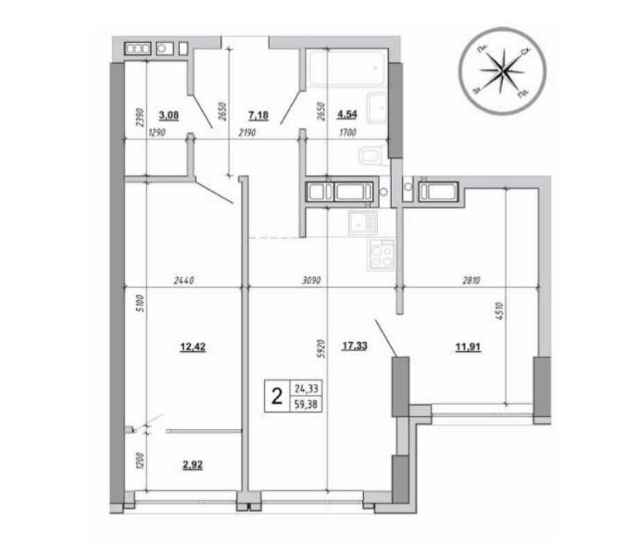 • Общая площадь 59.38 м2