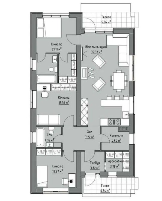 Планування дуже зручне: - простора кухня-вітальня, - три кімнати (дві дитячі та майстер-спальня з власним санвузлом і гардеробом), ще один санвузол, - гардеробна при вході та - технічне приміщення.