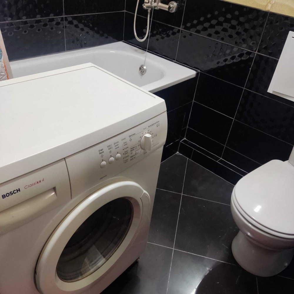 Техника: современная газовая колонка, холодильник, стиральная машинка, кондиционер, телевизор, микроволновка