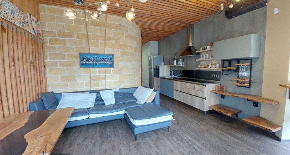Удобная планировка: кухня-гостиная с выходом на террасу, спальня с рабочей зоной, детская комната, совмещенный санузел (ванная + душевая).
