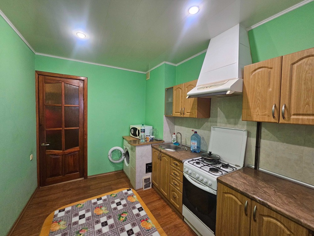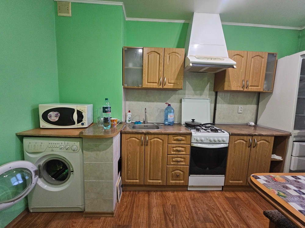 Кухня укомплектована всем необходимым: установлена кухонная мебель, плита, двухкамерный холодильник, стиральная машина, стол, кухонный уголок, микроволновка.