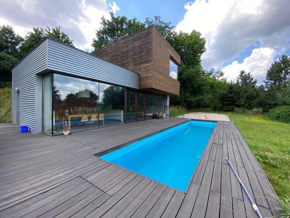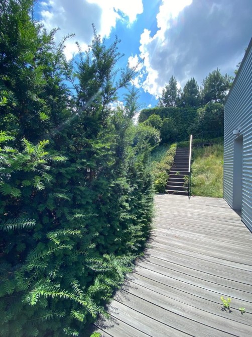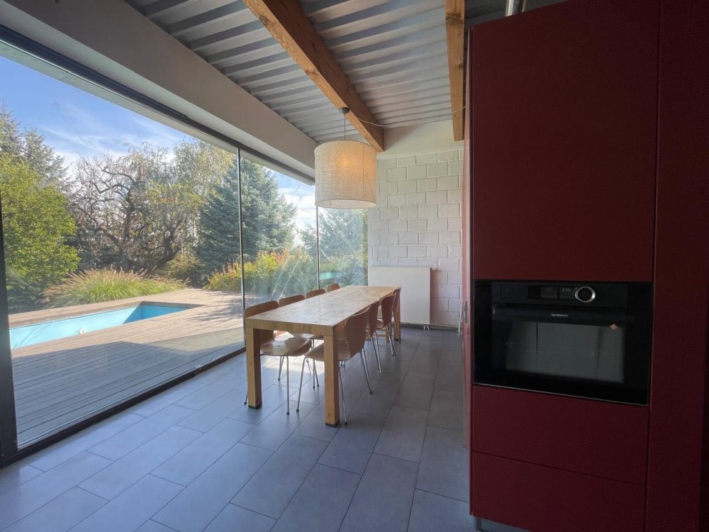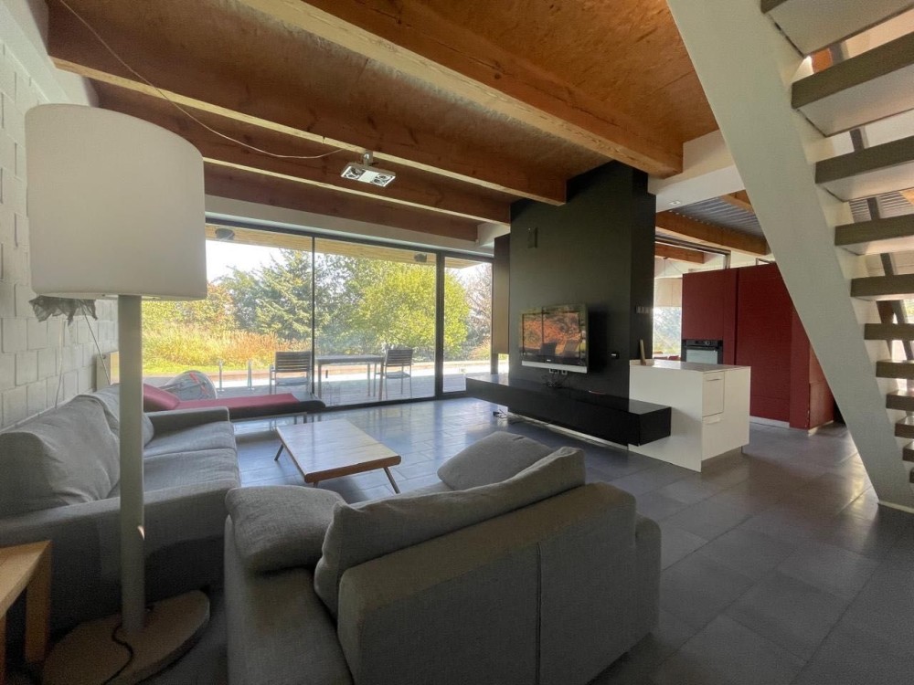 На 1-м этаже -прихожая, санузел, кухня-столовая и зона дневного пребывания, объединенная с садом и бассейном.