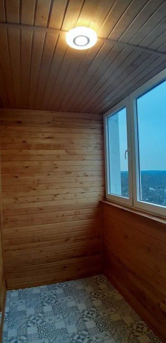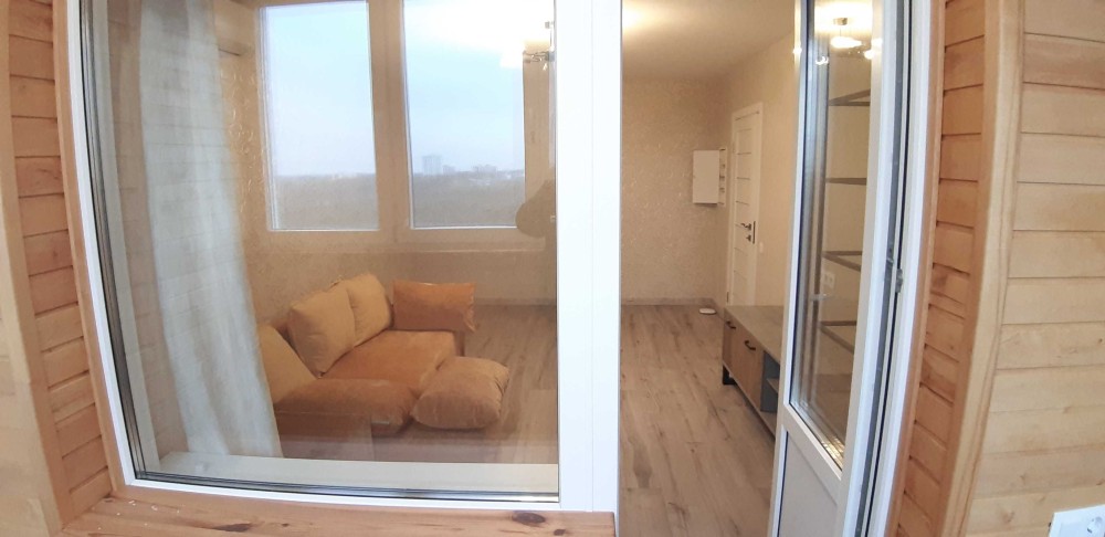В гостиной угловой диван и выход на застекленную лоджию оббитую ольхой ( очень красиво смотрится и приятный запах).