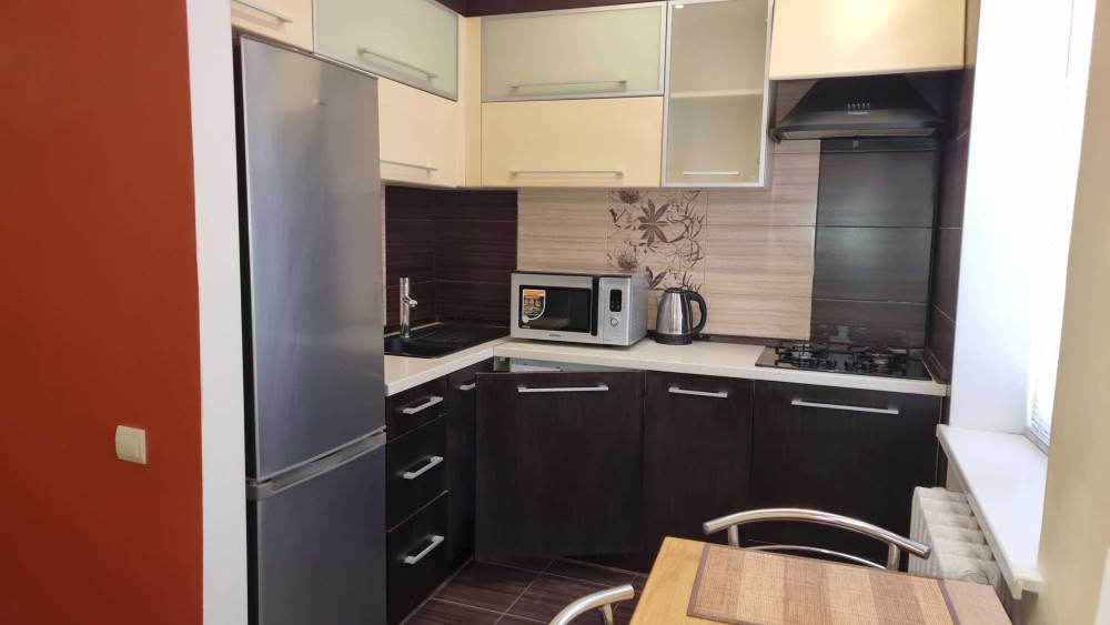 Сдаётся 1к-квартира в Соломенском районе, ул Уманская 23/9, первый этаж (бельэтаж) с Дизайнерским ремонтом, полностью меблированная, со всех необходимой бытовой техникой!( Новый большой угловой диван, посуда, газовая плита, телевизор, холодильник, микроволновая многофункциональная печь, стиральная машина, пылесос, утюг. ) Вид из окон на церковь и парк.