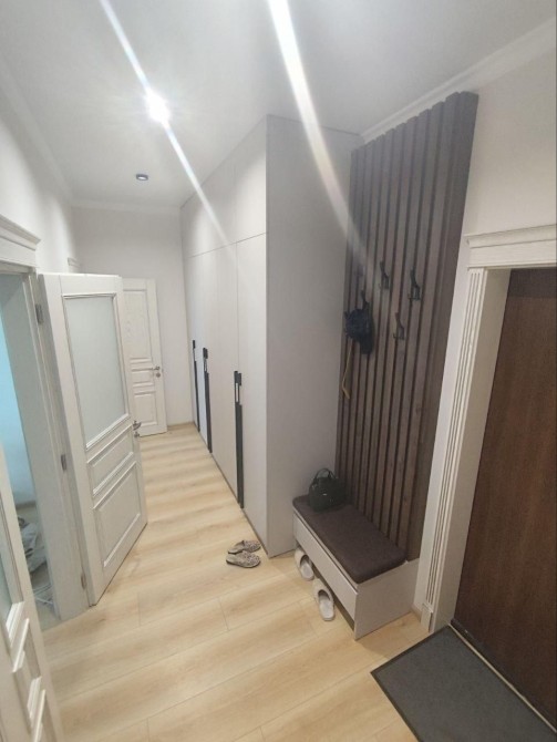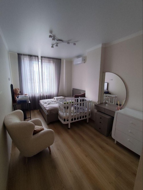 Общая площадь 75м2, 2 комнаты и кухня столовая. Гардеробная, шкаф-купе. Современный дизайнерский ремонт.