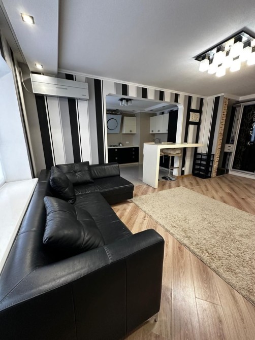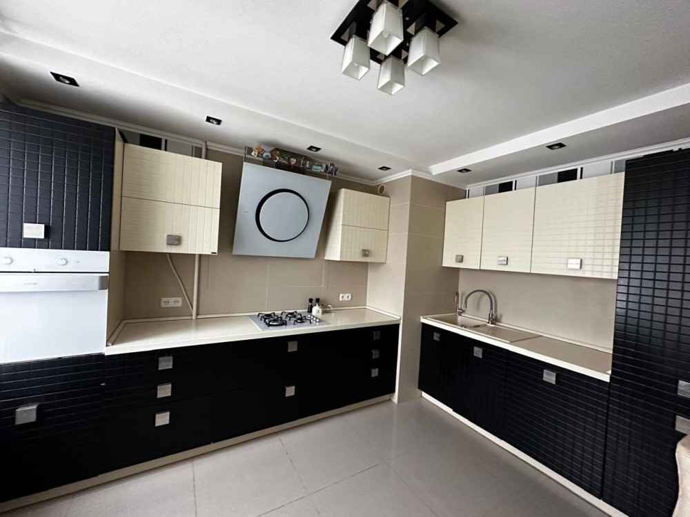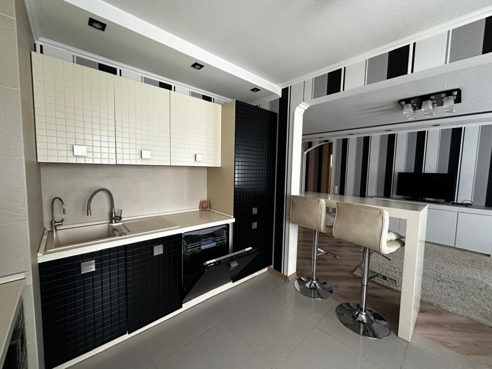 Кухня-гостиная с барной стойкой, 2 комнаты с мебелью, олна из них детская, в квартире есть все необходимое для проживания: холодильник, плита, посуда, кондиционер, посудомоечная машинка, плазменный телевизор, водонагревательный бак, стиральная машинка, WI-FI роутер.