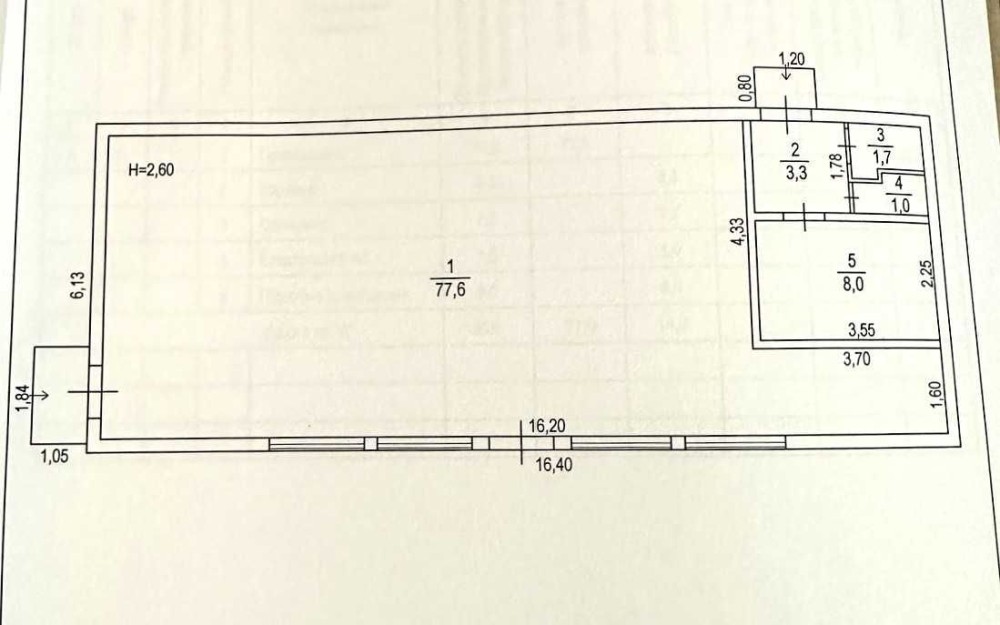 Планировка: основной зал — 78 м² (открытое пространство), подсобное помещение — 8 м², санузел с бойлером.
