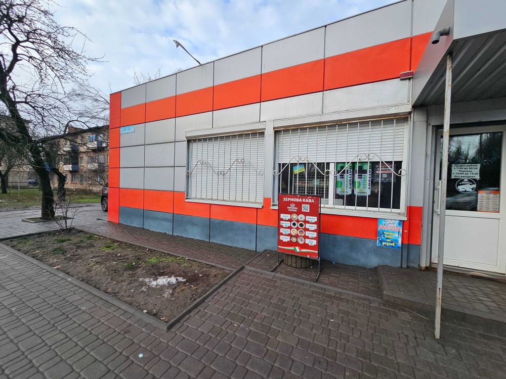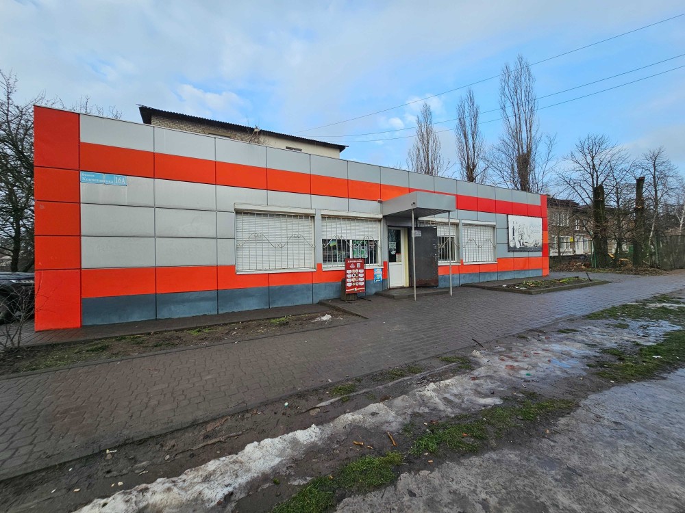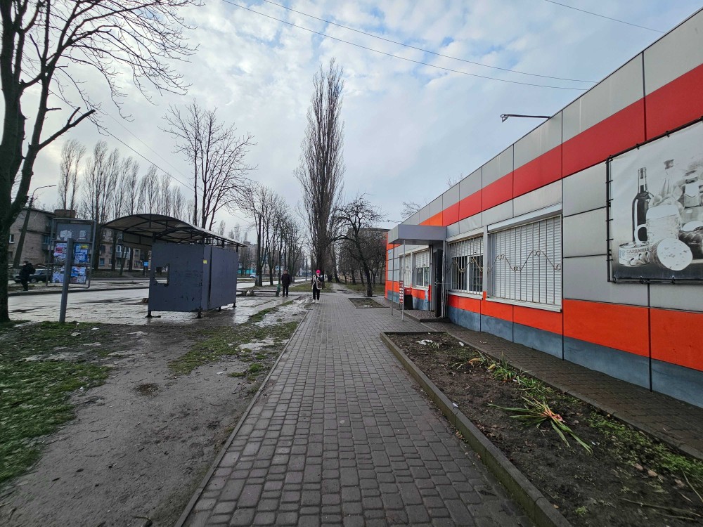 Отдельно стоящее здание на красной линии, прямо у остановки общественного транспорта, в центре жилмассива с активным пешеходным и автомобильным трафиком.