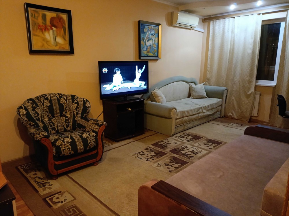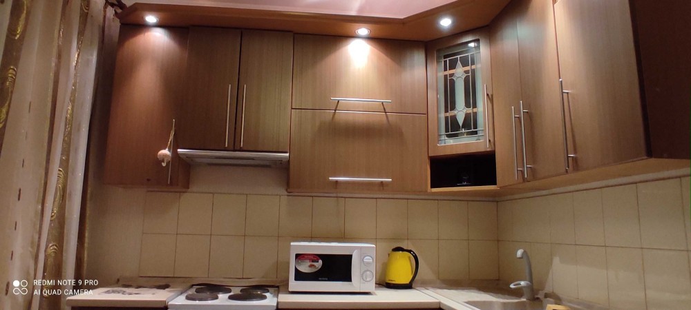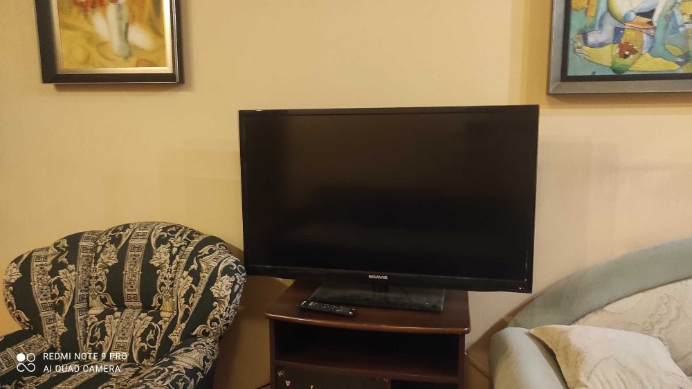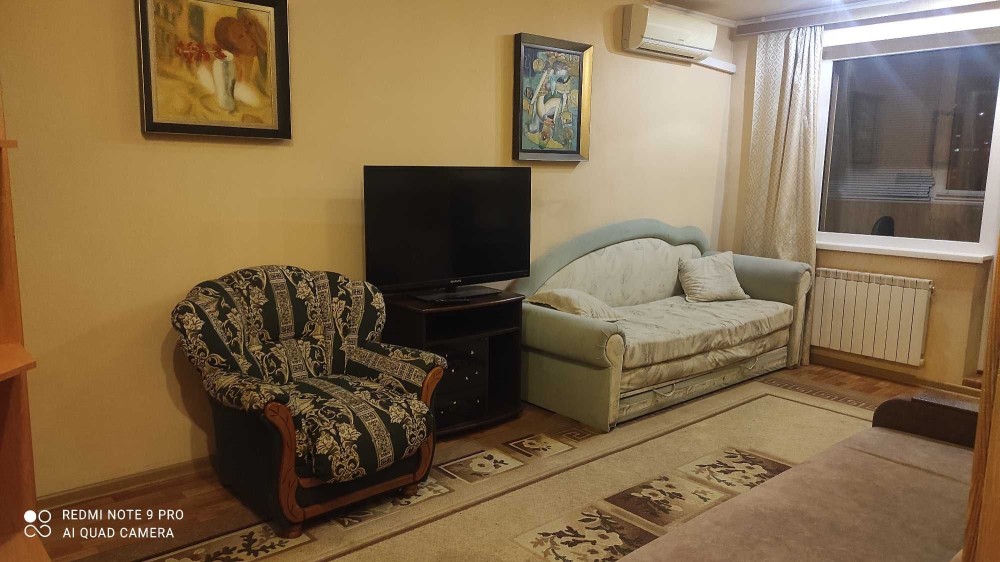 Підвісна стеля. Великий телевізор. Мебльована. Є великий засклений балкон. Пральна машина, мультиварка, холодильник, мікрохвильова пічь. Бронедвер. Кабельне телебачення.