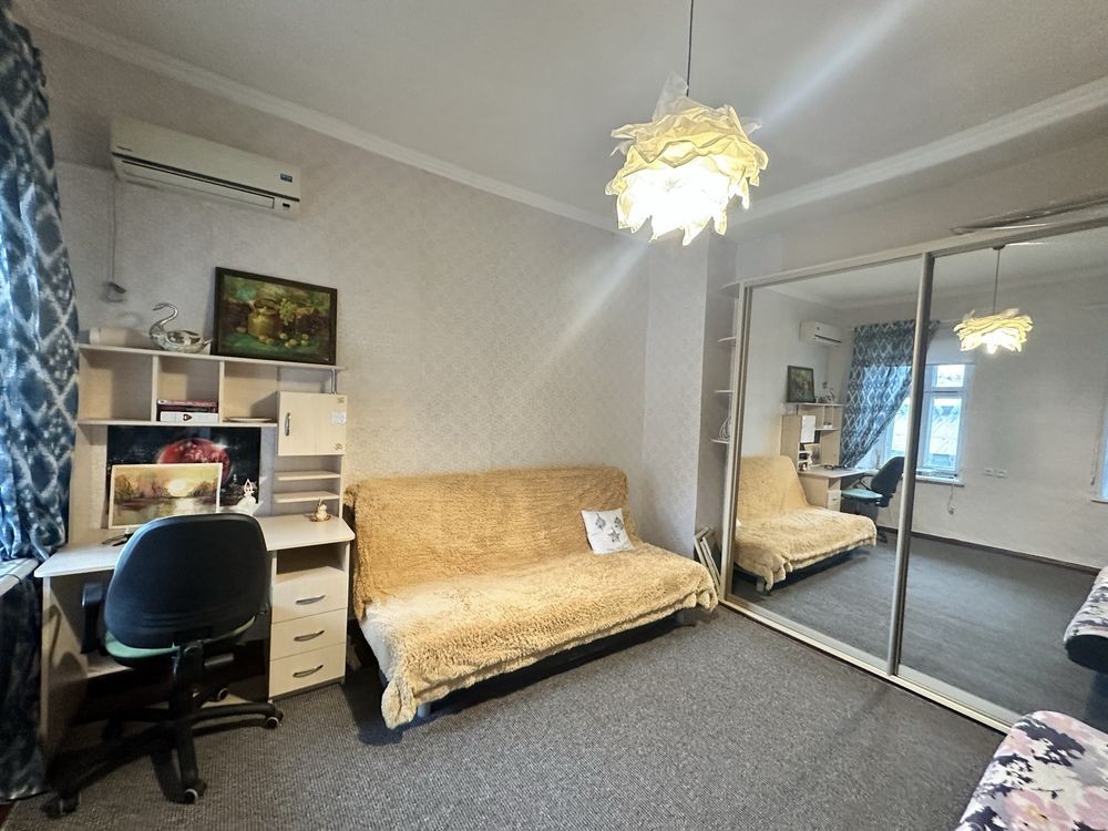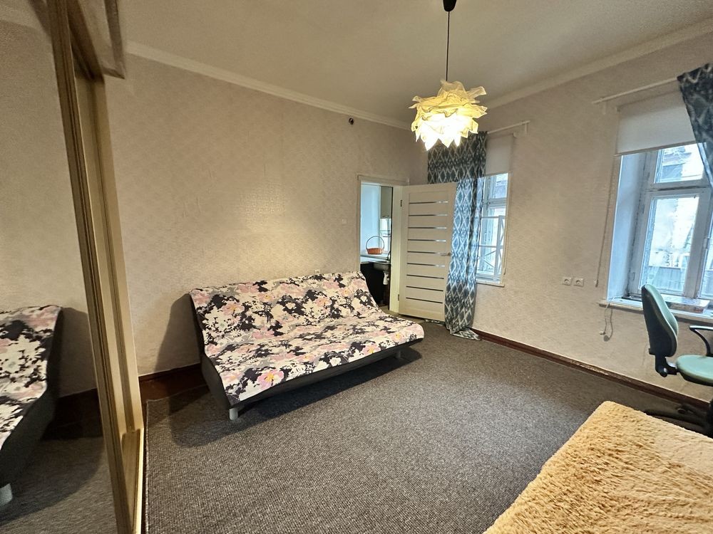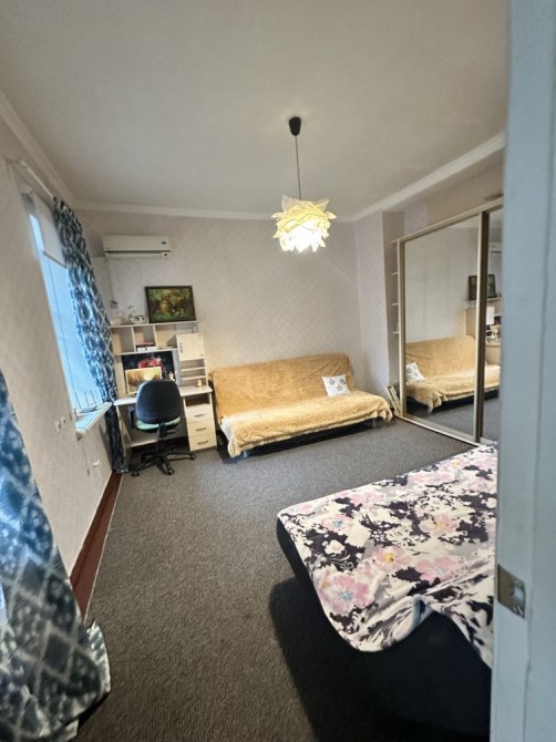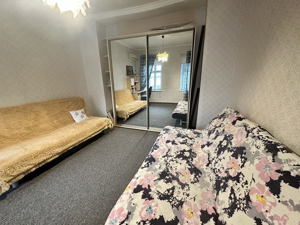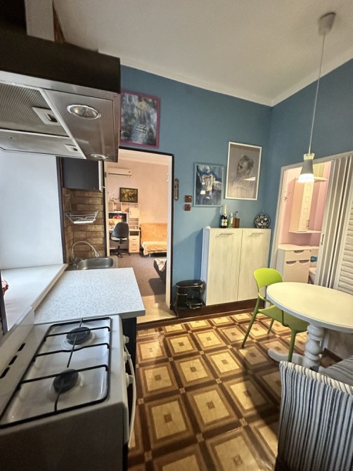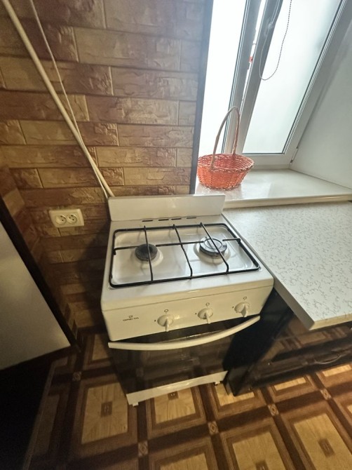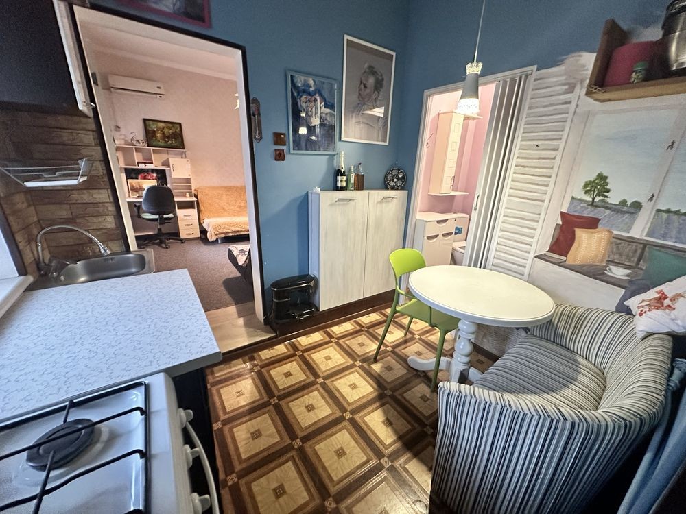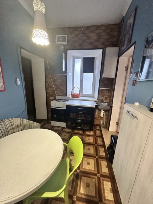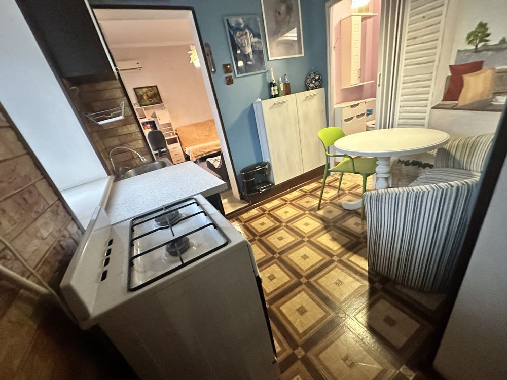 Небольшая кухня проходная, зато просторная комната. Есть 2 дивана, все необходимое на кухне.