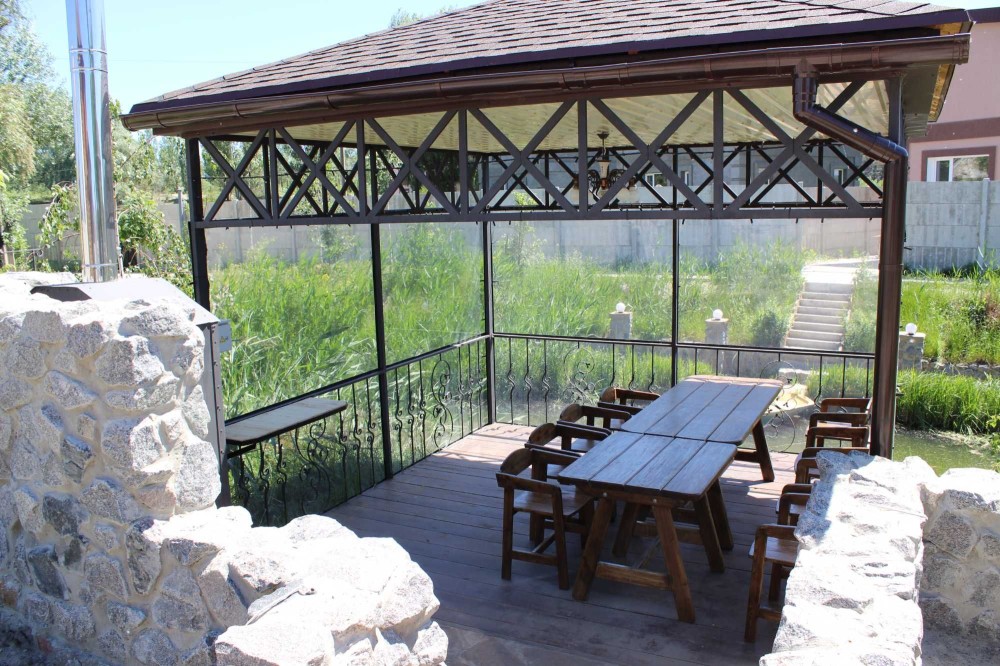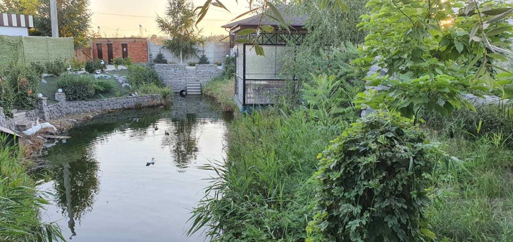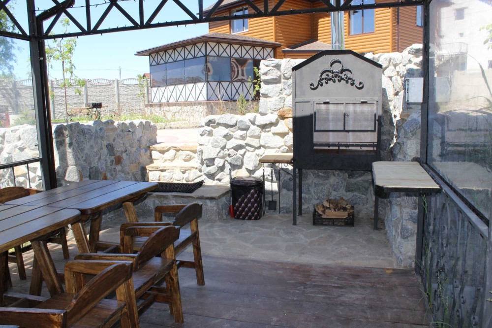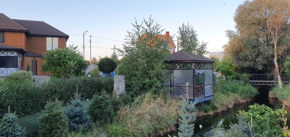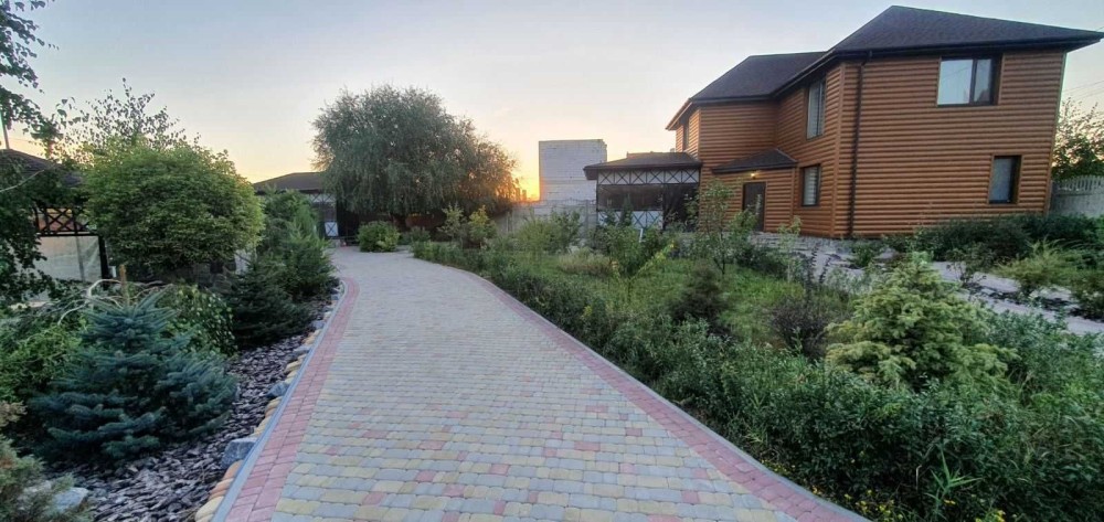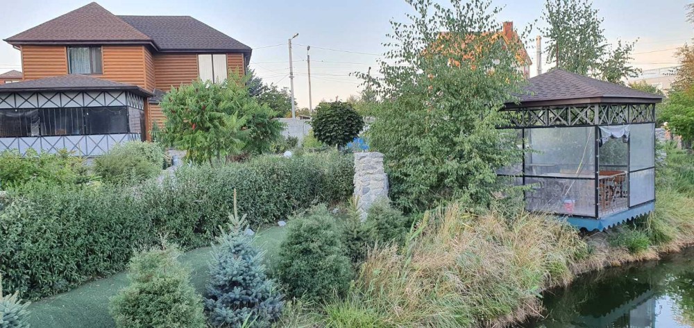 Очень большой двор с ландшафтным дизайном и декоративными растениями, есть парковка для машин. Летняя терасса, беседка с мангалом на територии.
