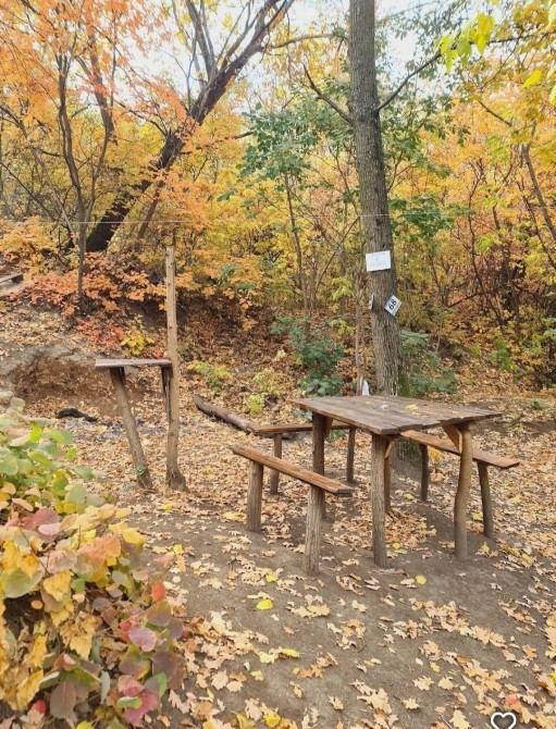 - зона отдыха с барбекю и лавочками , большим столом на природе в лесу,