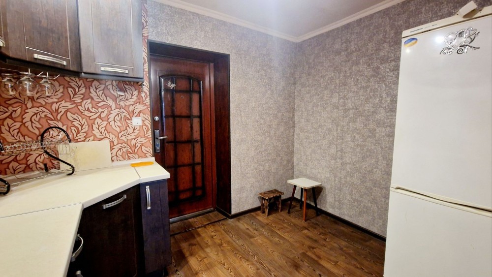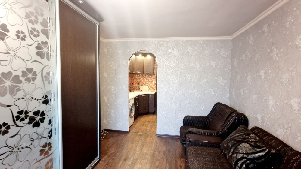 Разделена на две зоны, комнату и кухню. Кресло раскладное.