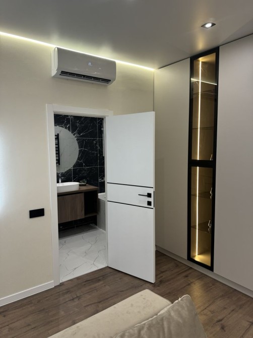 Квартира полностью укомплектована мебелью и техникой, установлены кондиционеры, телевизоры, LED-подсветка по периметру, Wi-Fi. Всё новое — от мебели до текстиля.