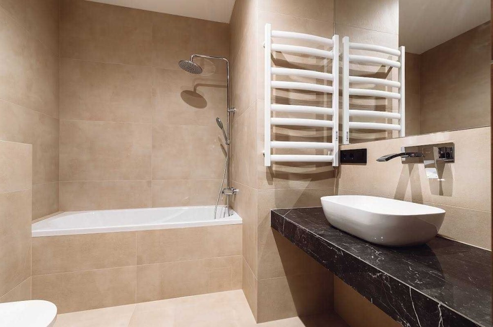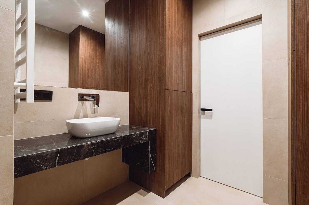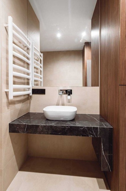При вході в квартиру - містка шафа для одягу та взуття, зліва - обладнана ванна кімната з усією необхідною сантехнікою, підключено бойлер, пральну машину, сушку для рушників. У ванній кімнаті тепла підлога.