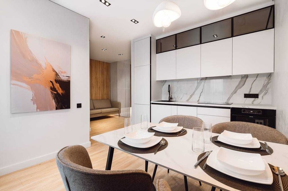 І окремо кухня з робочою поверхнею та обідньою зоною. Вбудована вся побутова техніка: