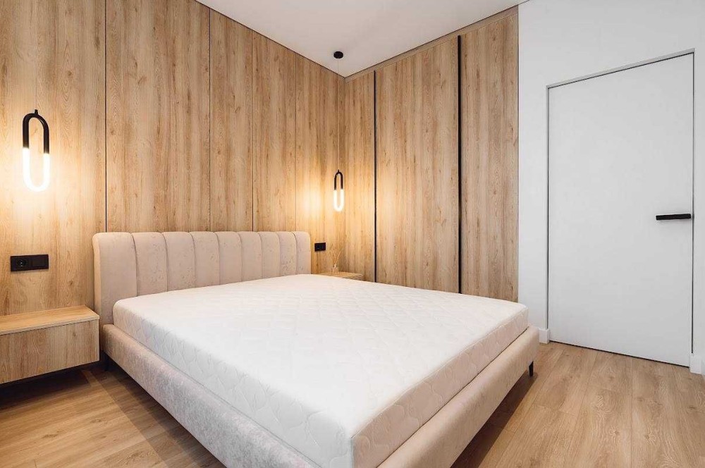 В спальні - велике ліжко на два спальних місця, також є шафа для зберігання речей.