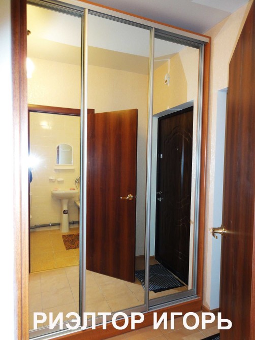 - Есть встроенная кухня, обеденный стол, стулья, двуспальный диван - "еврокнижка", письменный стол, трюмо, 2 зеркальных шкафа-купе, тумба для телевизор.