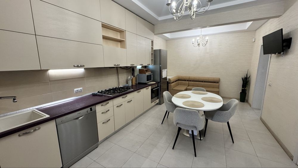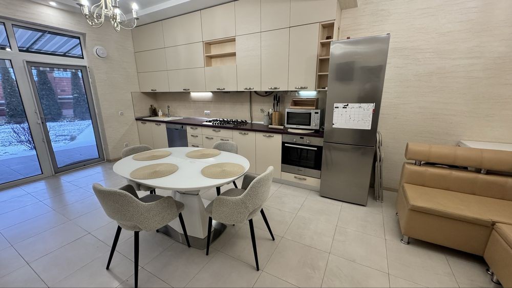 Дом двухэтажный: 1- просторный коридор, санузел с душевой, просторная кухня, укомплектованная всей необходимой бытовой техникой, включая посудомоечную и сушильную машины, с выходом на задний дворик и гостевая спальня с большим удобным диваном, так же с выходом зеленую зону дворика; 2- холл с диваном, спальня с гардеробной комнатой, две детских спальни и с/у с ванной. Отопление автономное (двухконтурный газовый котел). Полная автономия - при отключении электричества, происходит автоматическое переключение, которое вы даже не ощутите). Так же есть генератор. Есть вместительная кладовка (отдедьный вход с улицы). Крытое паркоместо, с улицы роллет. Комплекс лучший на поселке Котовского и один из лучших в городе! Разрешается проживание с домашними питомцами мелких пород.