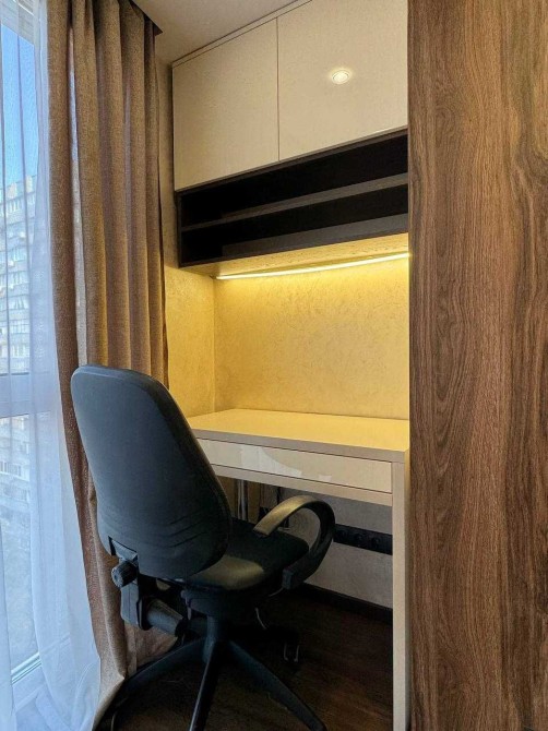 Є зручне робоче місце зі столом і кріслом для тих, хто цінує комфорт і функціональність.