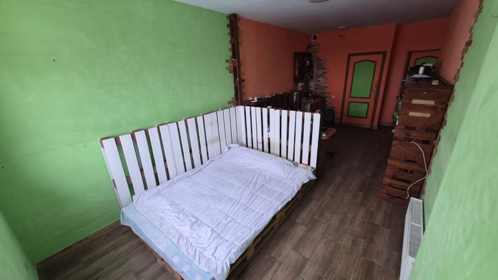 В квартире есть мебель, кровать, полки и кухня, точно как на фотографии на обьявление.