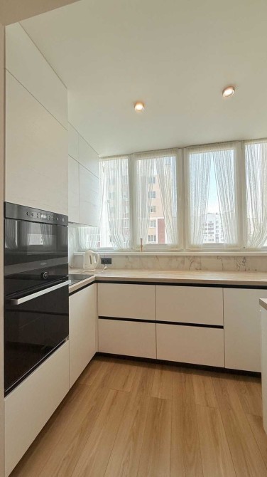 - Кухня-вітальня з вбудованими кухонними меблями, кондиціонером обіднім столом, шафою та диванчиком.