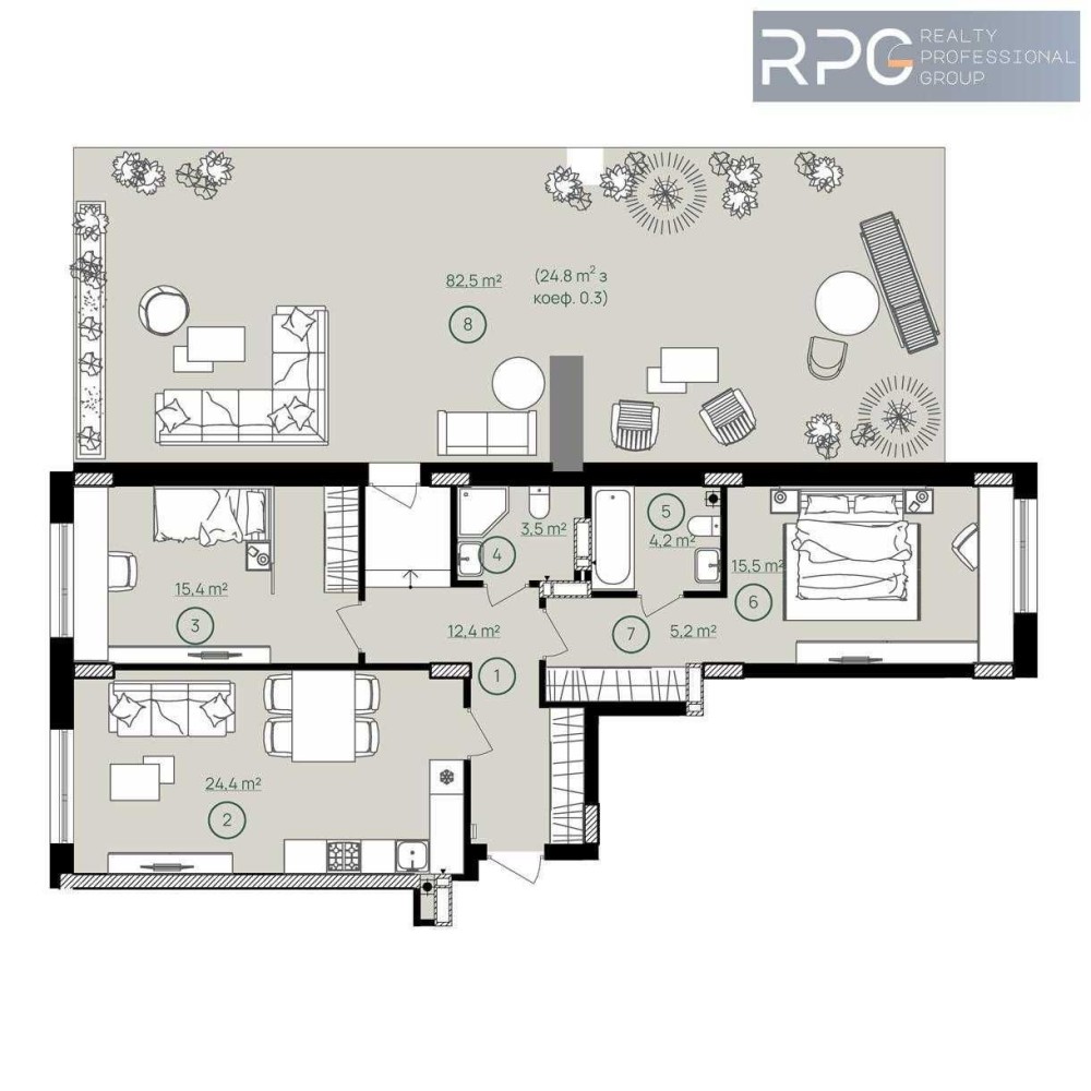 - Квартира вирізняється великою терасою площею 82,5 м², яка стане чудовим місцем для сімейних сніданків, дитячих ігор або затишних вечорів просто неба.