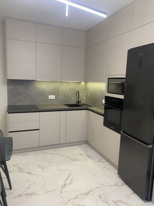 Квартира оборудована всей необходимой техникой и мебелью: плита и духовка Hansa, посудомоечная и стиральная машина Whirlpool, сенсорная вытяжка.