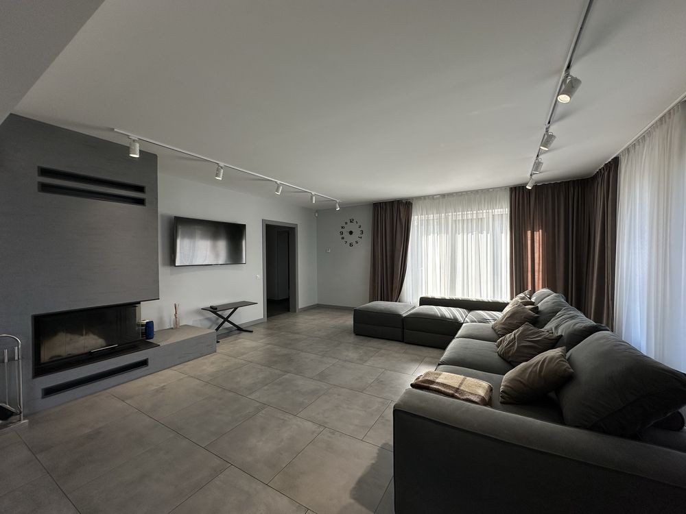 На первом этаже огромная кухня гостиная с натуральным камином,большая гардеробная,санузел и гостевая комната.