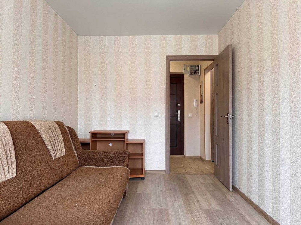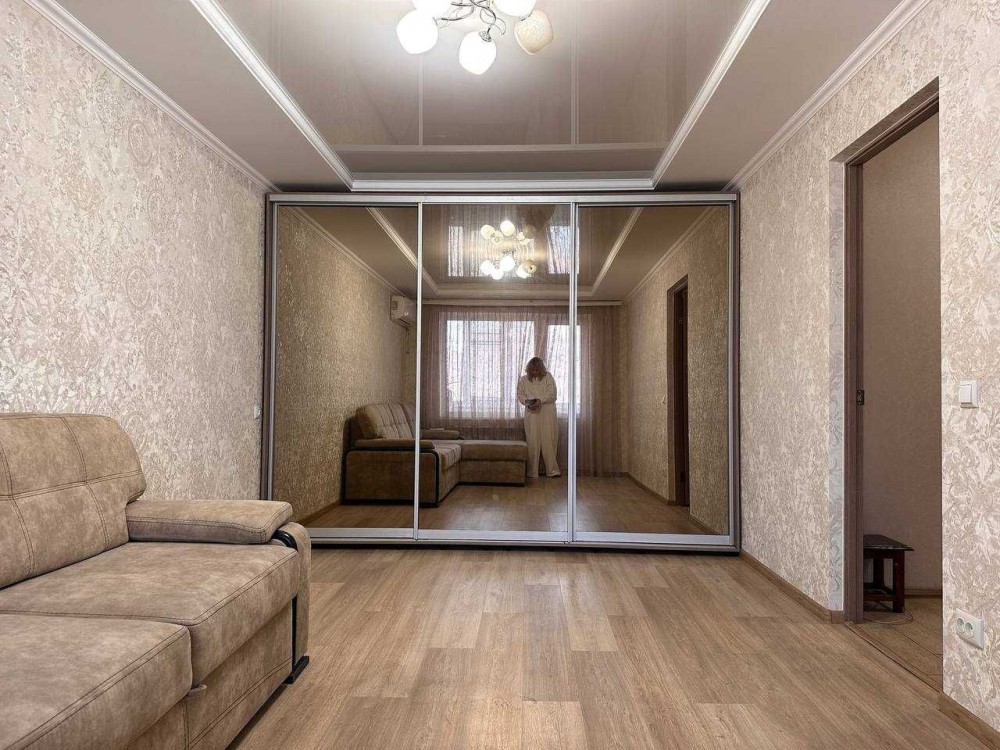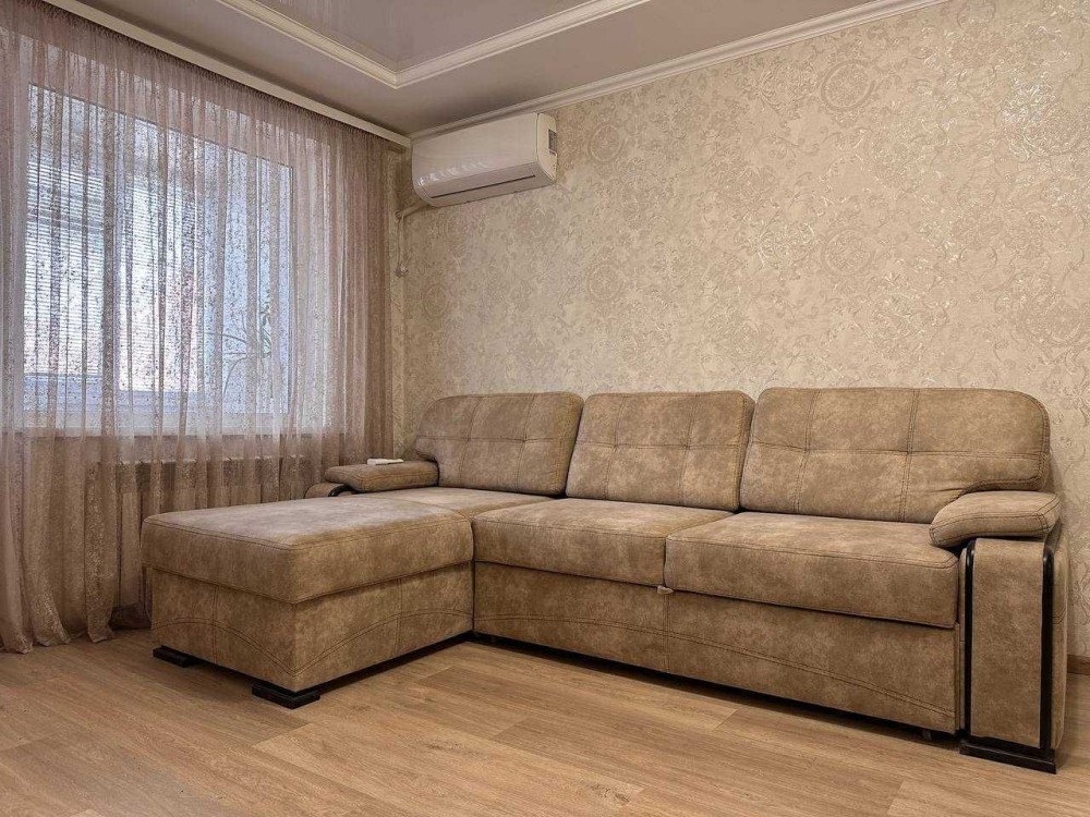 • Просторная гостиная с огромным угловым диваном – уютные семейные вечера обеспечены. Кондиционер создаст комфортный микроклимат, а шкаф-купе на всю стену вместит всё необходимое.