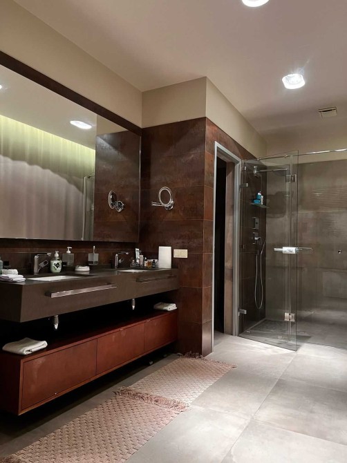 Общая площадь 400 кв.м. , 4 уровня. 3 просторные спальни с гардеробными и балконами, кухня-гостиная (57 кв. м), 5 санузлов.