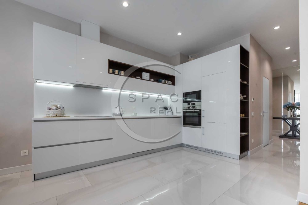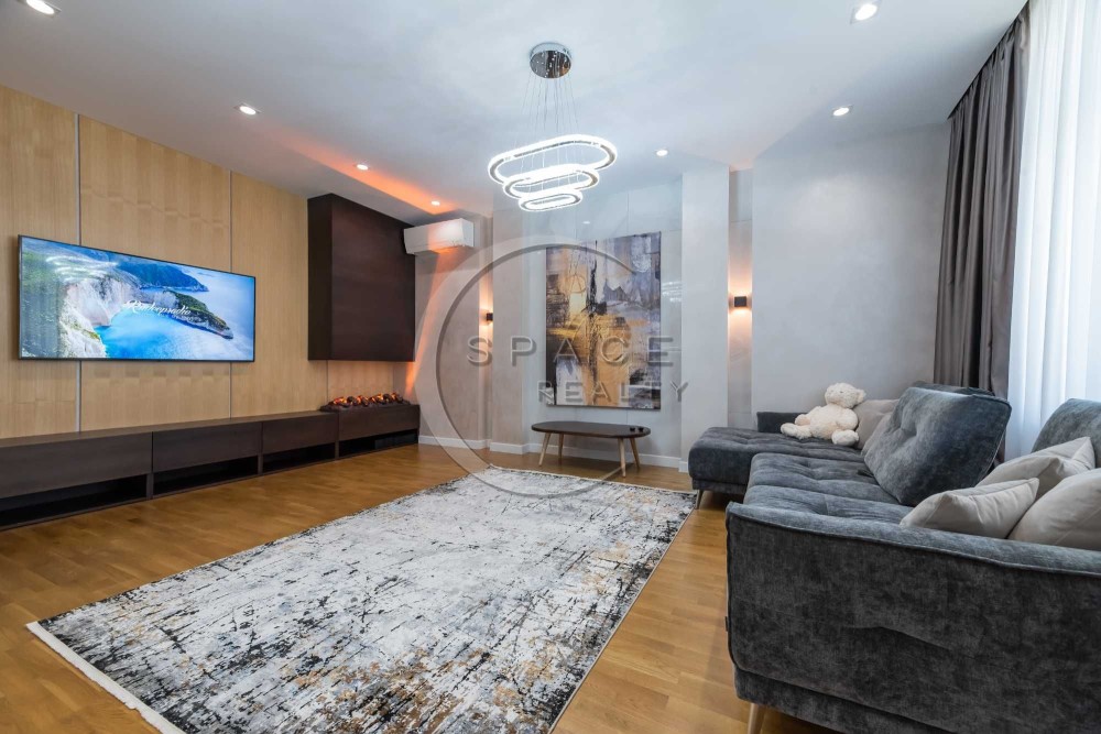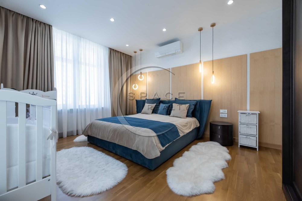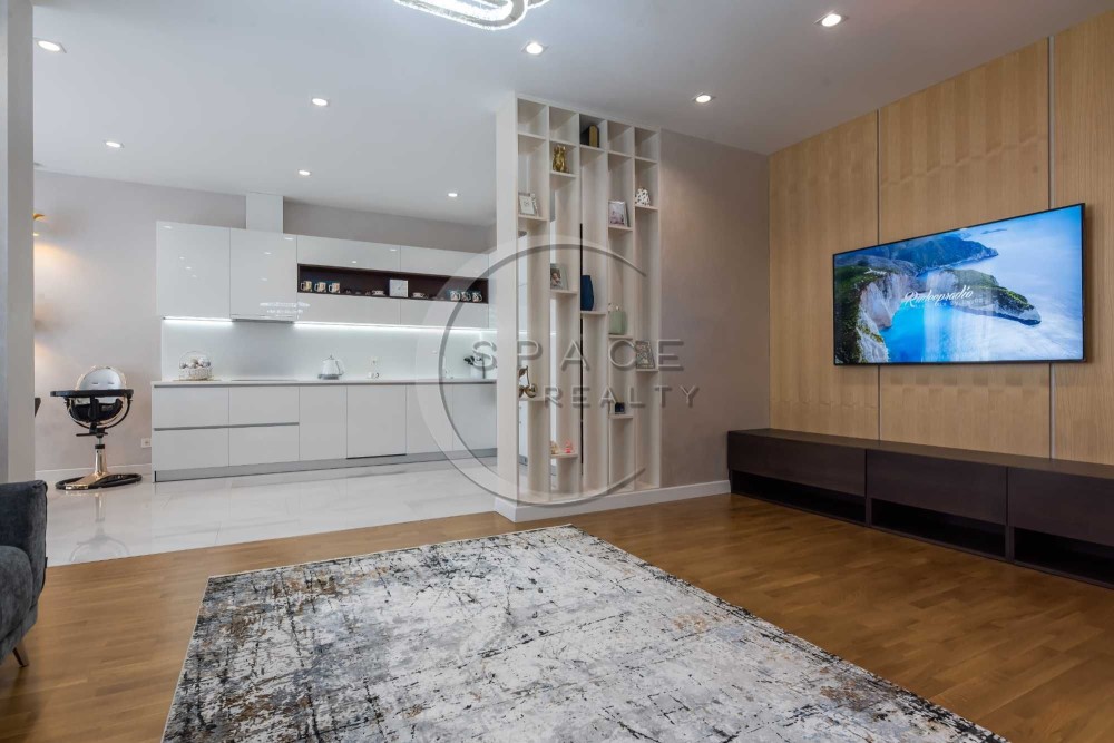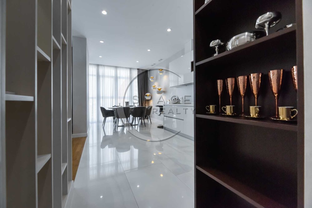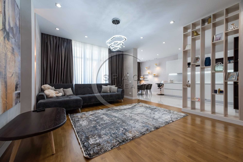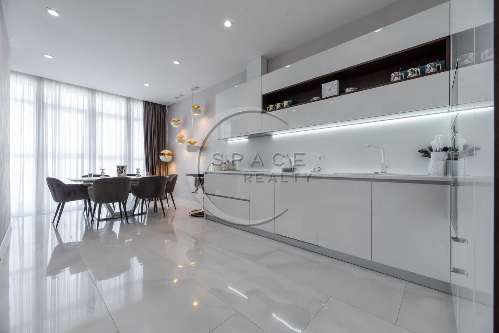 Квартира зі зручним плануванням: дві розкішні спальні, велика вітальня поєднана з кухнею – їдальні, тепла підлога, два санвузли з ванною та душовою, багато вбудованих шаф, балкон. Квартира світла, затишна, виконано високоякісний ремонт. Повністю обладнана сучасною технікою та меблями від найкращих світових брендів, панорамні вікна.