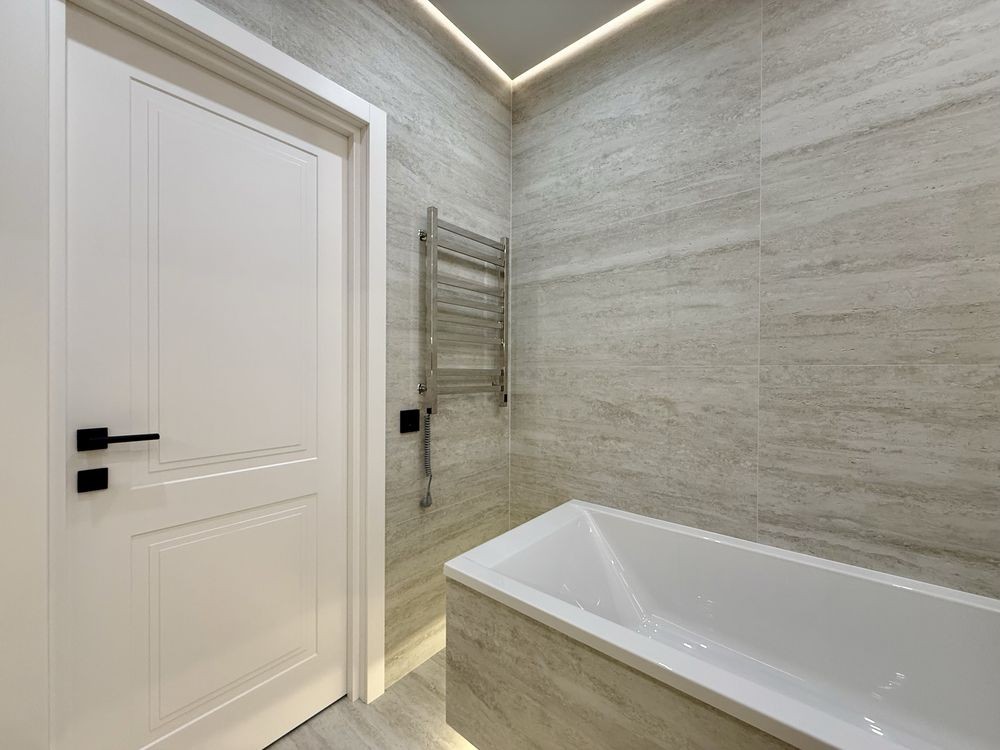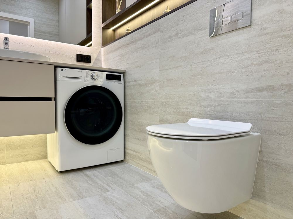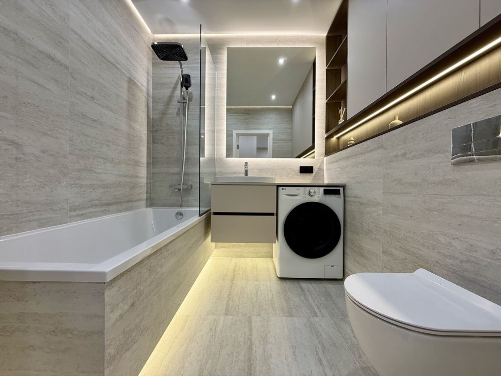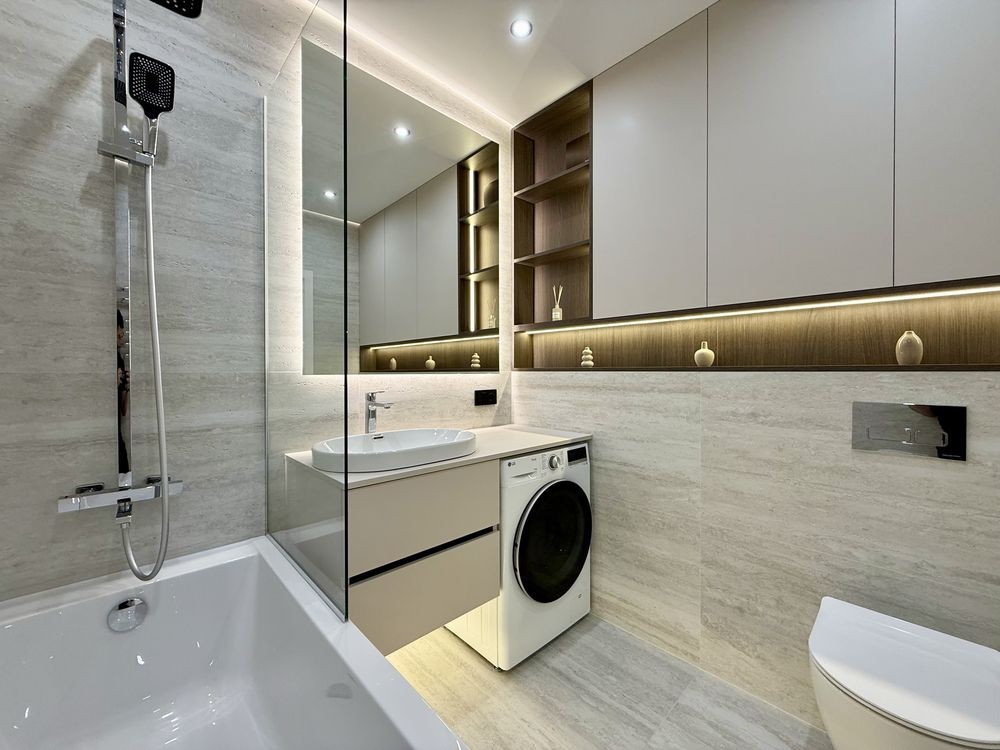 - Санвузол з ванною та тропічним душем, інсталяцією, умивальником, прально-сушильною машиною та місцем для зберігання.